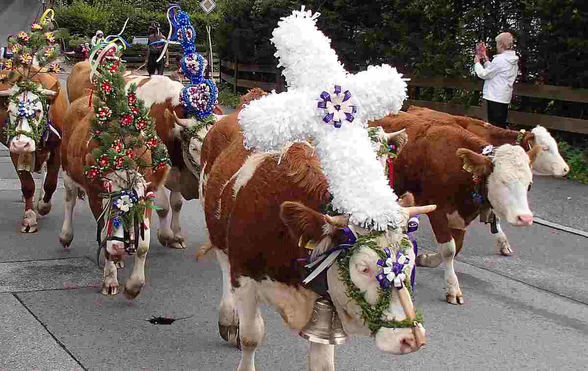 die Alpenstraße nach Hause. Die Tiere sind teilweise geschmückt.